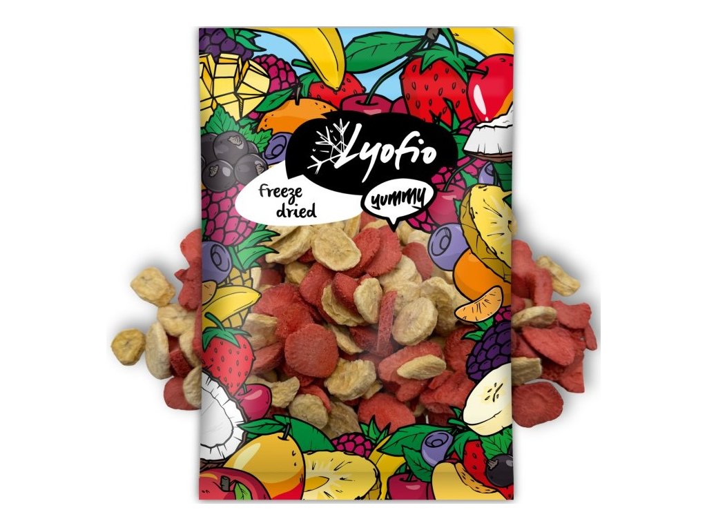 Sladký banán a voňavá jahoda – to je lyofilizované kombo, které u dětí vždycky boduje. A když navíc zábavně křupe, nerozpatlá se a dá se jíst i bez lžičky? Ideální parťák do školky, školy i na hřiště. Směs je složená jen z mrazem sušeného ovoce – bez přidaného cukru, barviv a aromat.